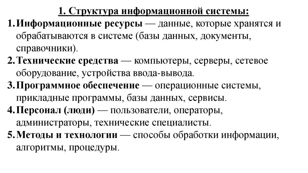 1. Структура информационной системы:1.Информационные ресурсы — данные, которые хранятся и