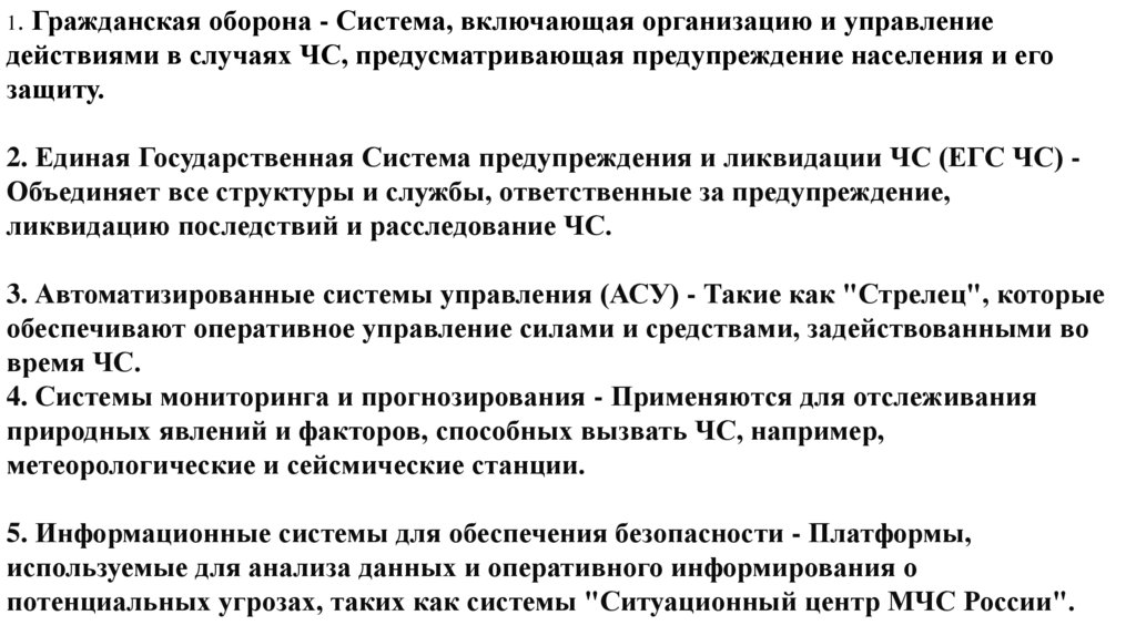 1. Гражданская оборона - Система, включающая организацию и управлениедействиями в случаях ЧС, предусматривающая предупреждение населения и его