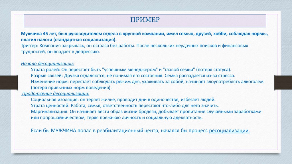 ПРИМЕРМужчина 45 лет, был руководителем отдела в крупной компании, имел семью, друзей, хобби, соблюдал нормы,