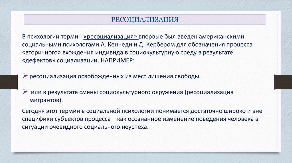 РЕСОЦИАЛИЗАЦИЯВ психологии термин «ресоциализация» впервые был введен американскими