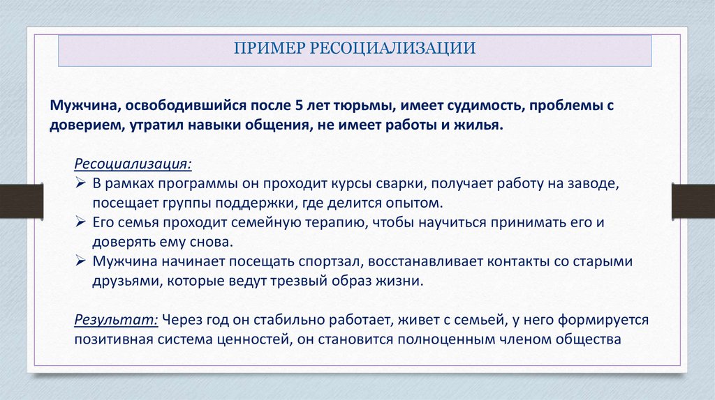 ПРИМЕР РЕСОЦИАЛИЗАЦИИМужчина, освободившийся после 5 лет тюрьмы, имеет судимость, проблемы с