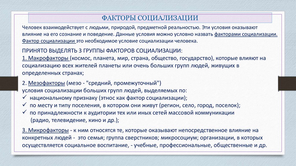 ФАКТОРЫ СОЦИАЛИЗАЦИИЧеловек взаимодействует с людьми, природой, предметной реальностью. Эти условия оказывают