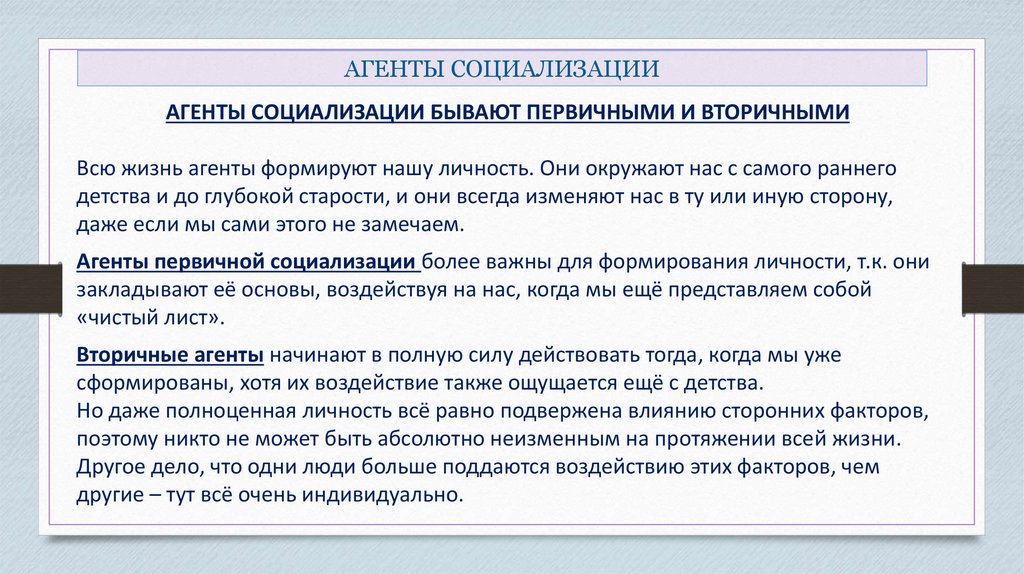 АГЕНТЫ СОЦИАЛИЗАЦИИАГЕНТЫ СОЦИАЛИЗАЦИИ БЫВАЮТ ПЕРВИЧНЫМИ И ВТОРИЧНЫМИ