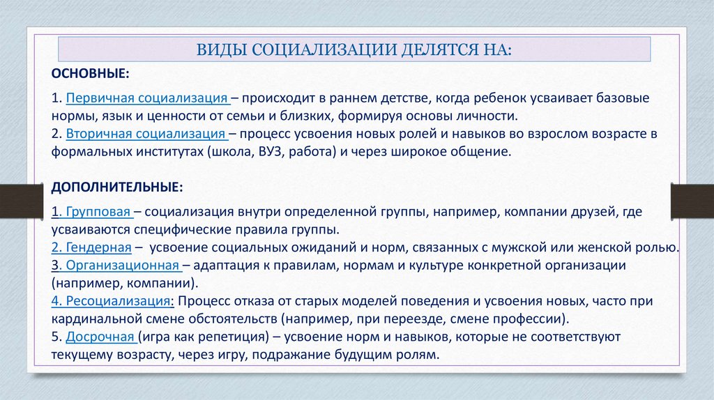 ВИДЫ СОЦИАЛИЗАЦИИ ДЕЛЯТСЯ НА:ОСНОВНЫЕ: