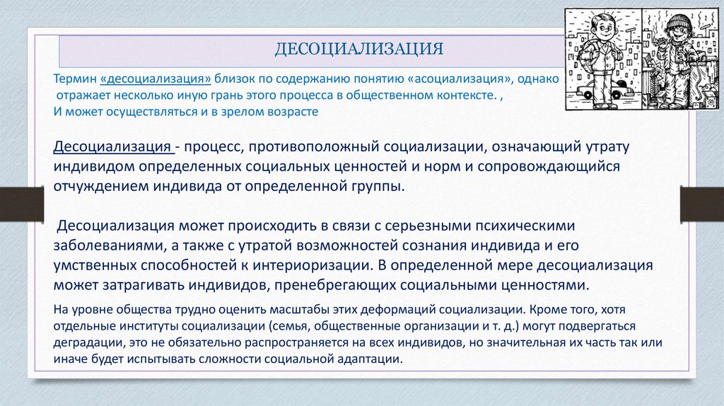 ДЕСОЦИАЛИЗАЦИЯТермин «десоциализация» близок по содержанию понятию «асоциализация», однако