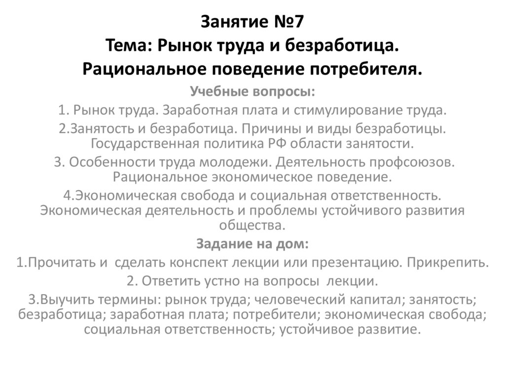 1. Занятие №7 Тема: Рынок труда и безработица. Рациональное поведение потребителя.