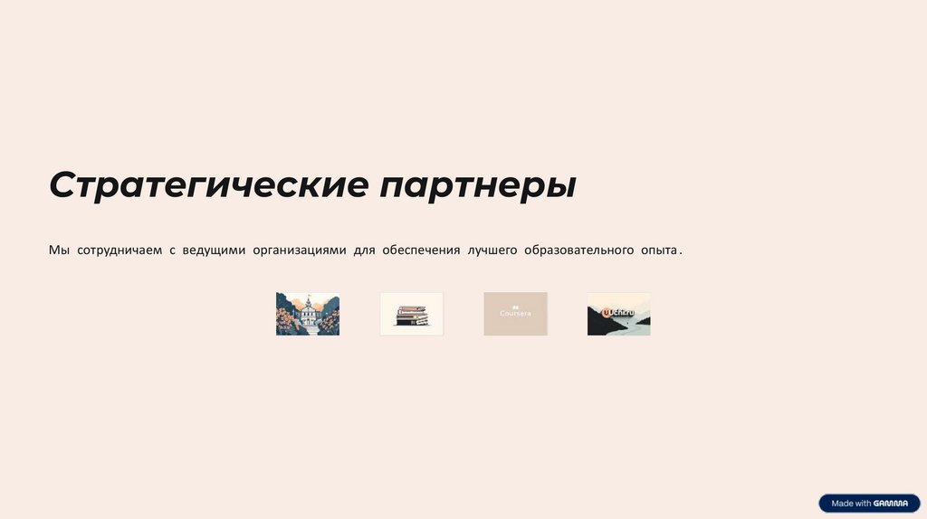 Стратегические партнерыМы сотрудничаем с ведущими организациями для обеспечения лучшего образовательного опыта.