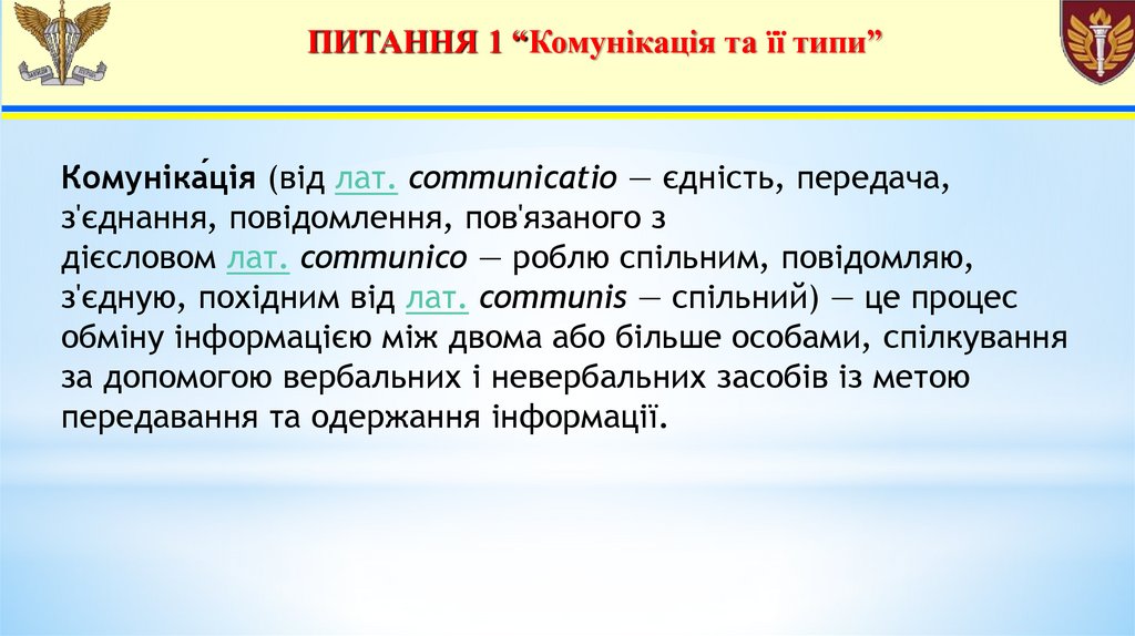 ПИТАННЯ 1 “Комунікація та її типи”Комуніка́ція (від лат. communicatio — єдність, передача,
