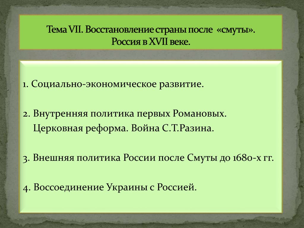 1. Тема VII. Восстановление страны после «смуты». Россия в XVII веке.