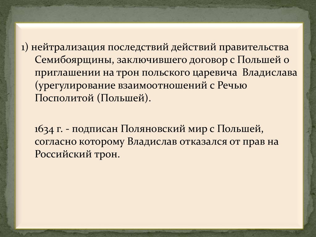1) нейтрализация последствий действий правительстваСемибоярщины, заключившего договор с Польшей о