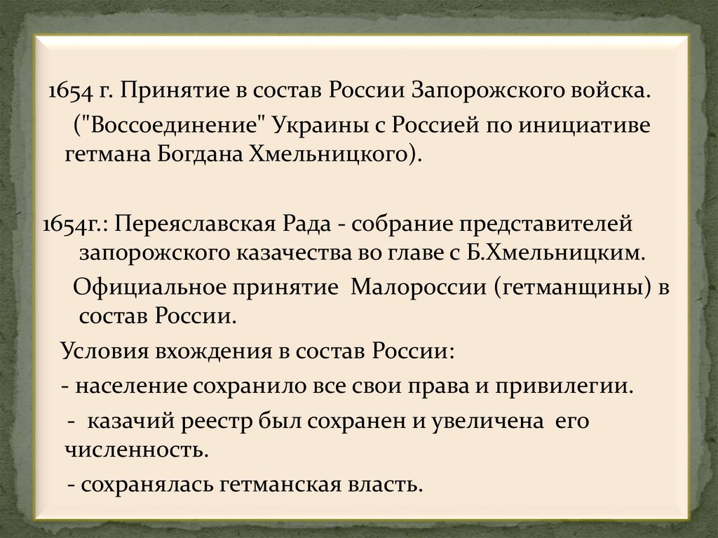 1654 г. Принятие в состав России Запорожского войска.("Воссоединение" Украины с Россией по инициативе