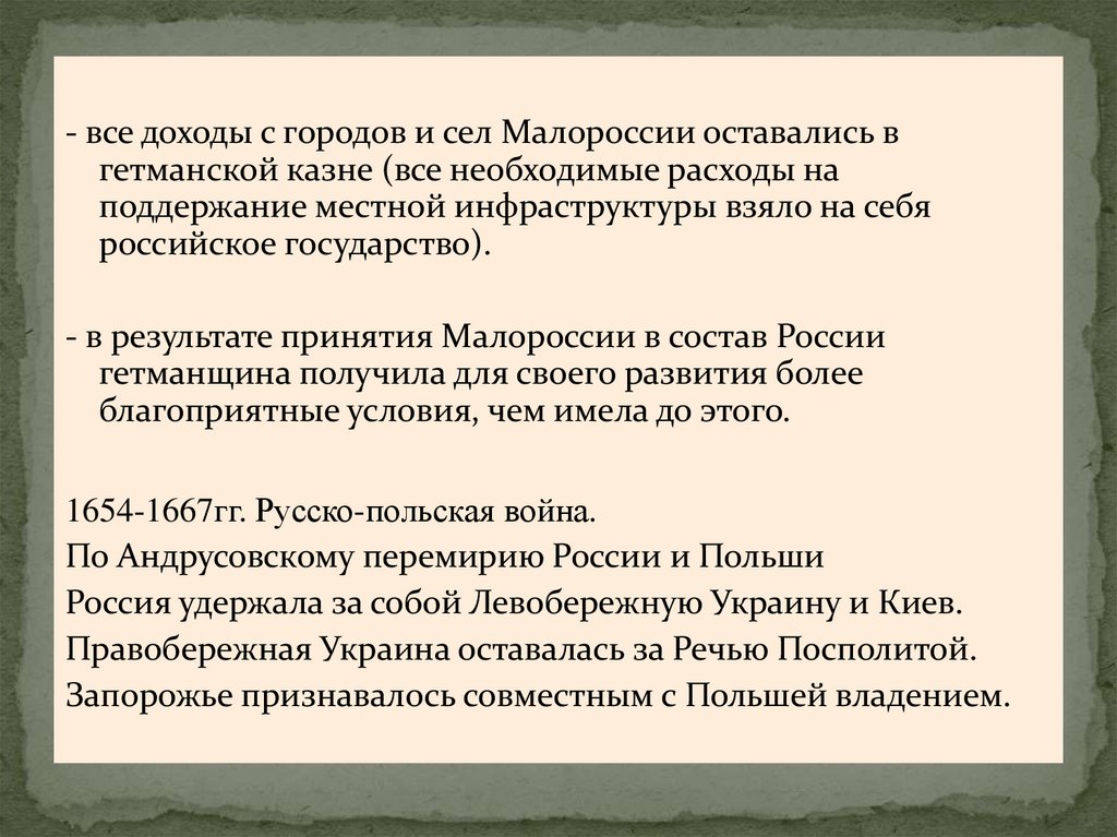 Россия удержала за собой Левобережную Украину и Киев.
