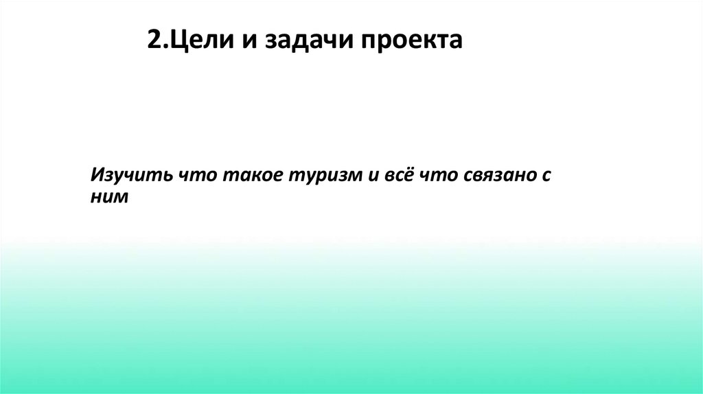 2.Цели и задачи проектаИзучить что такое туризм и всё что связано с