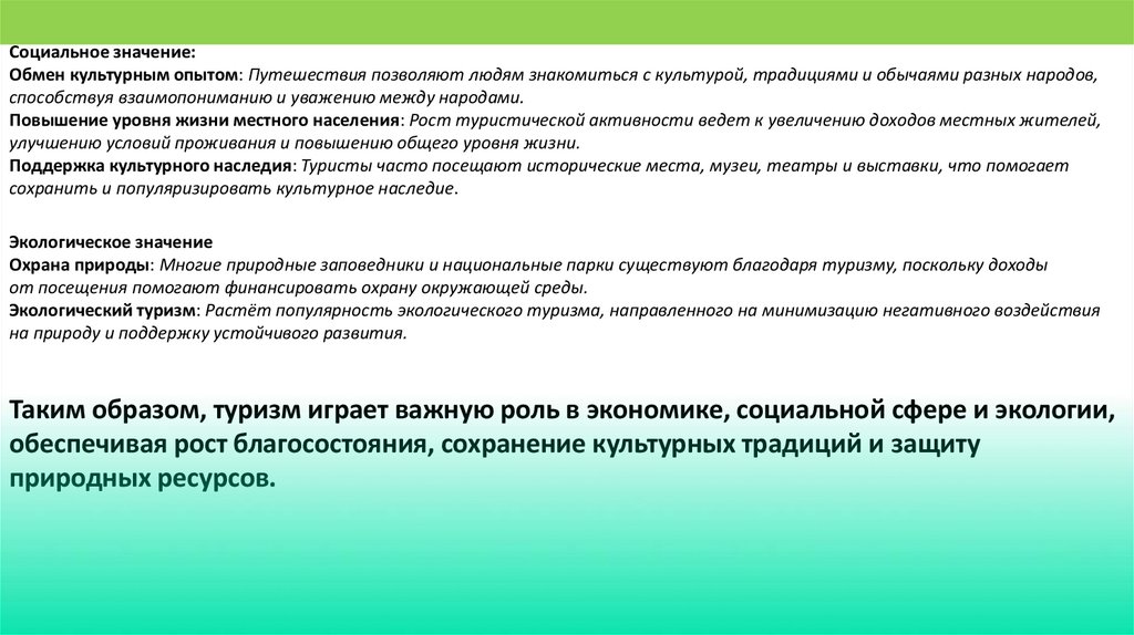 Таким образом, туризм играет важную роль в экономике, социальной сфере и экологии,