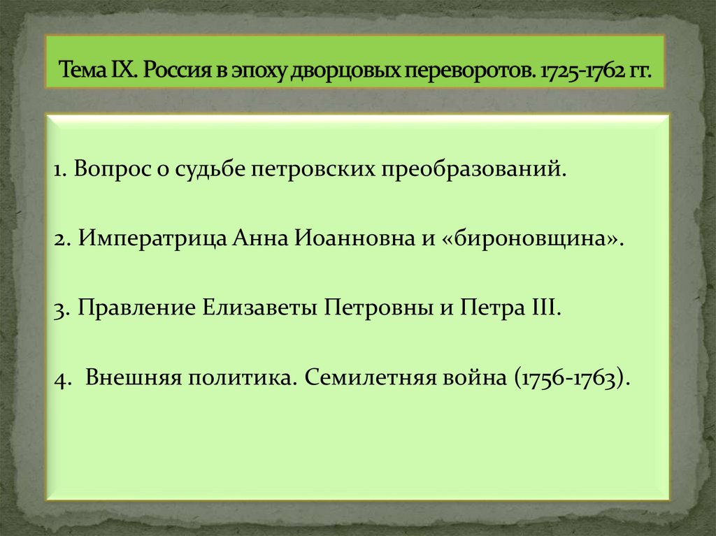 1. Тема IX. Россия в эпоху дворцовых переворотов. 1725-1762 гг.
