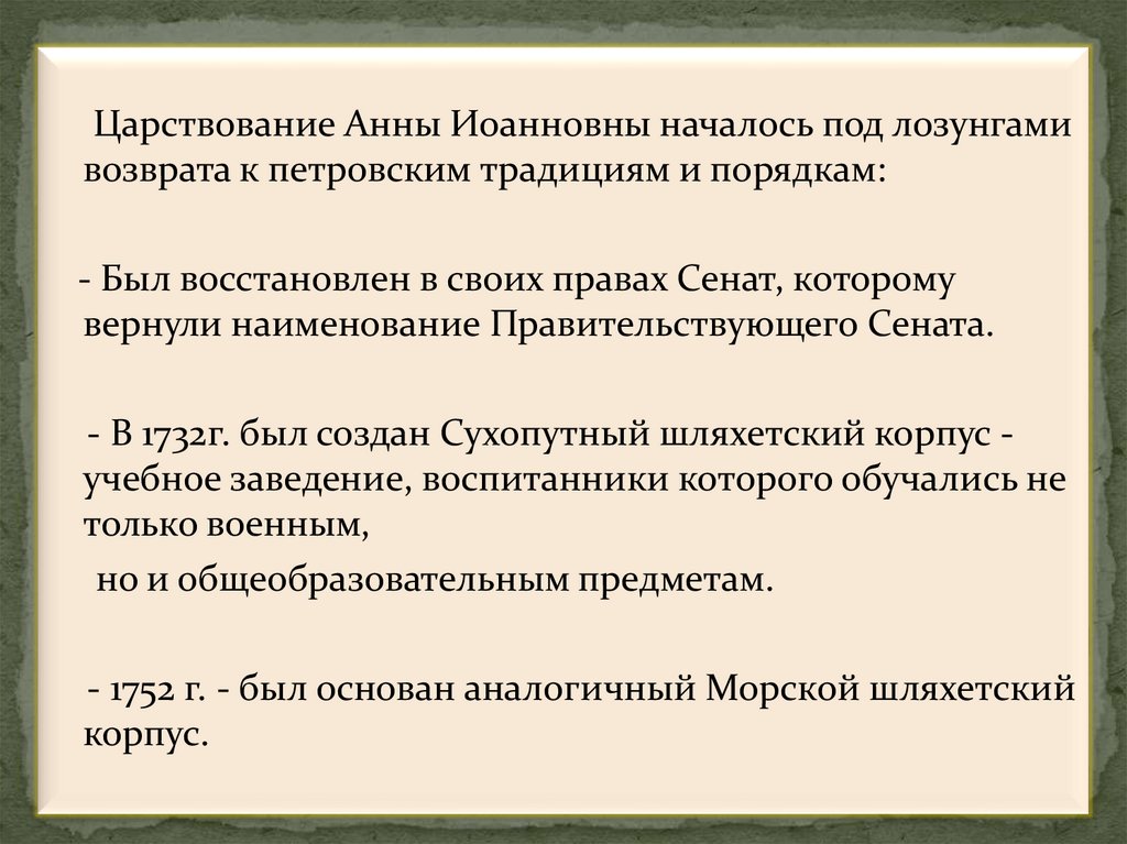 - В 1732г. был создан Сухопутный шляхетский корпус учебное заведение, воспитанники которого обучались не