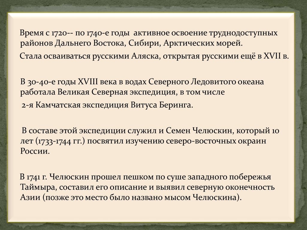 Время с 1720-- по 1740-е годы активное освоение труднодоступныхрайонов Дальнего Востока, Сибири, Арктических морей.