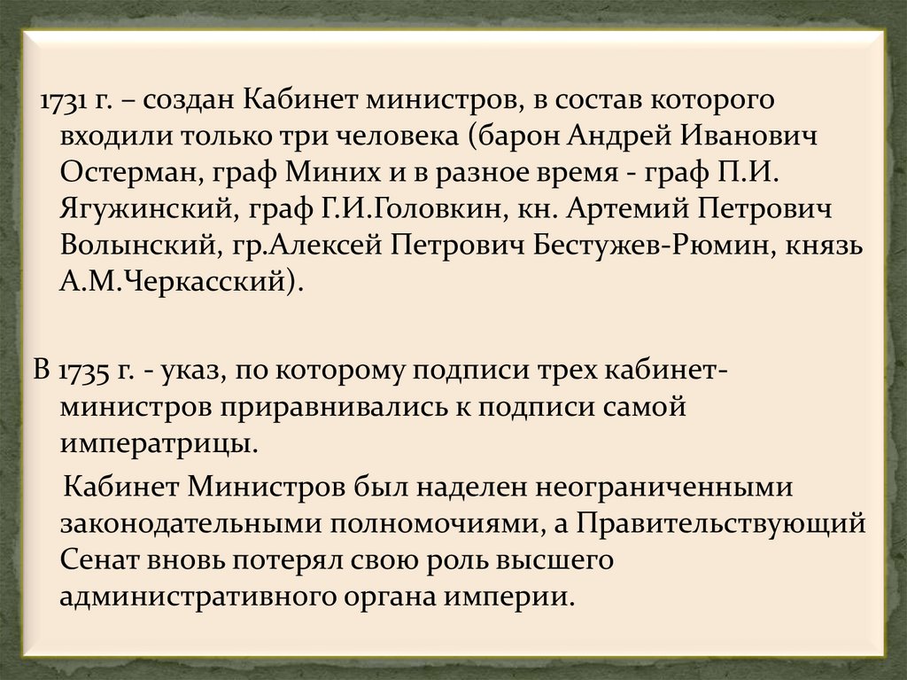 1731 г. – создан Кабинет министров, в состав котороговходили только три человека (барон Андрей Иванович