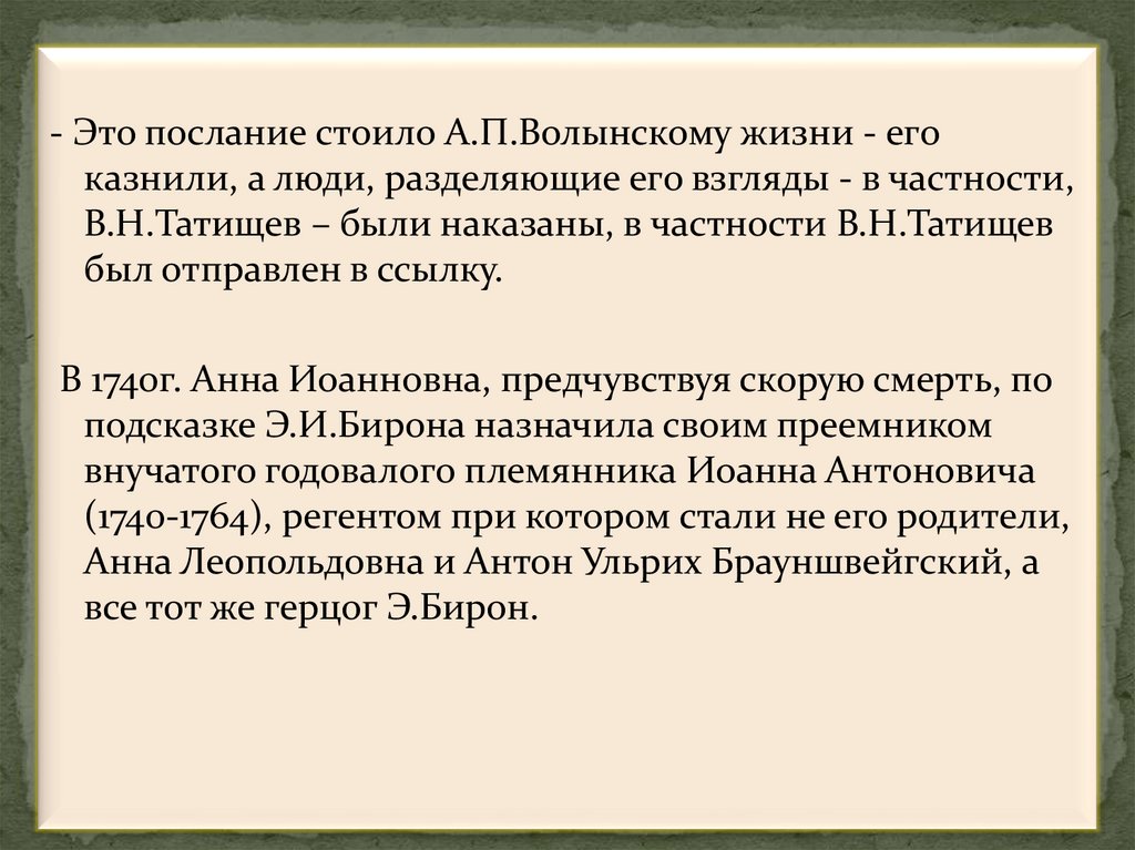 Анна Иоанновна – племянница Петра I, дочь его старшего братаИвана, герцогиня курляндская (род. 1693-ум.1740).