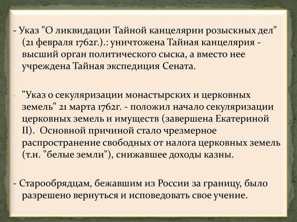 - Указ "О ликвидации Тайной канцелярии розыскных дел"(21 февраля 1762г.).: уничтожена Тайная канцелярия высший орган политического сыска, а вместо нее