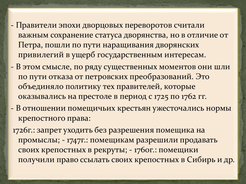 - Правители эпохи дворцовых переворотов считаливажным сохранение статуса дворянства, но в отличие от