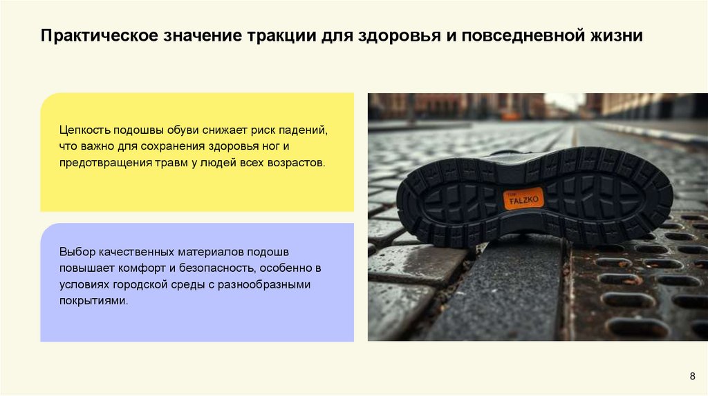 Практическое значение тракции для здоровья и повседневной жизниЦепкость подошвы обуви снижает риск падений,