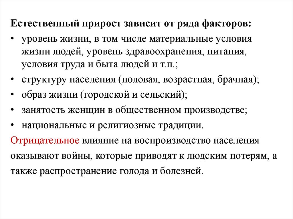 Естественный прирост зависит от ряда факторов:• уровень жизни, в том числе материальные условия