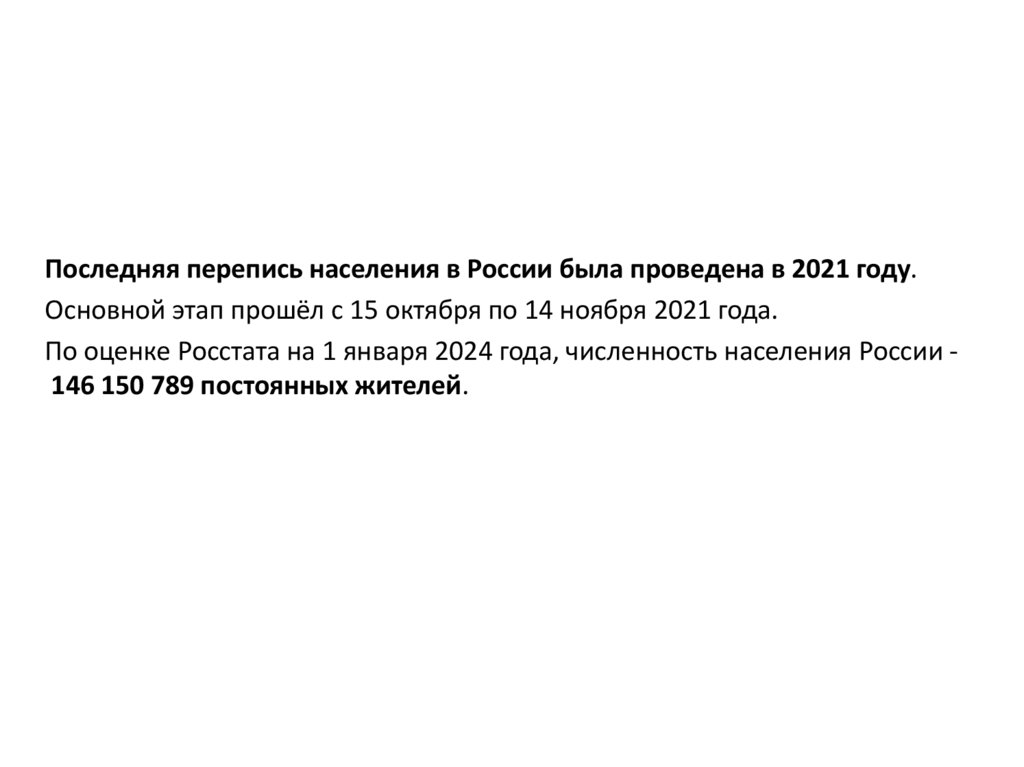 Последняя перепись населения в России была проведена в 2021 году.Основной этап прошёл с 15 октября по 14 ноября 2021 года.
