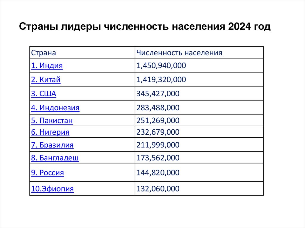 Страны лидеры численность населения 2024 годСтрана