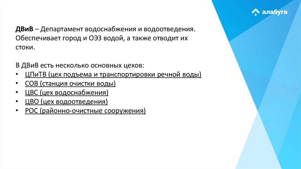 ДВиВ – Департамент водоснабжения и водоотведения.Обеспечивает город и ОЭЗ водой, а также отводит их