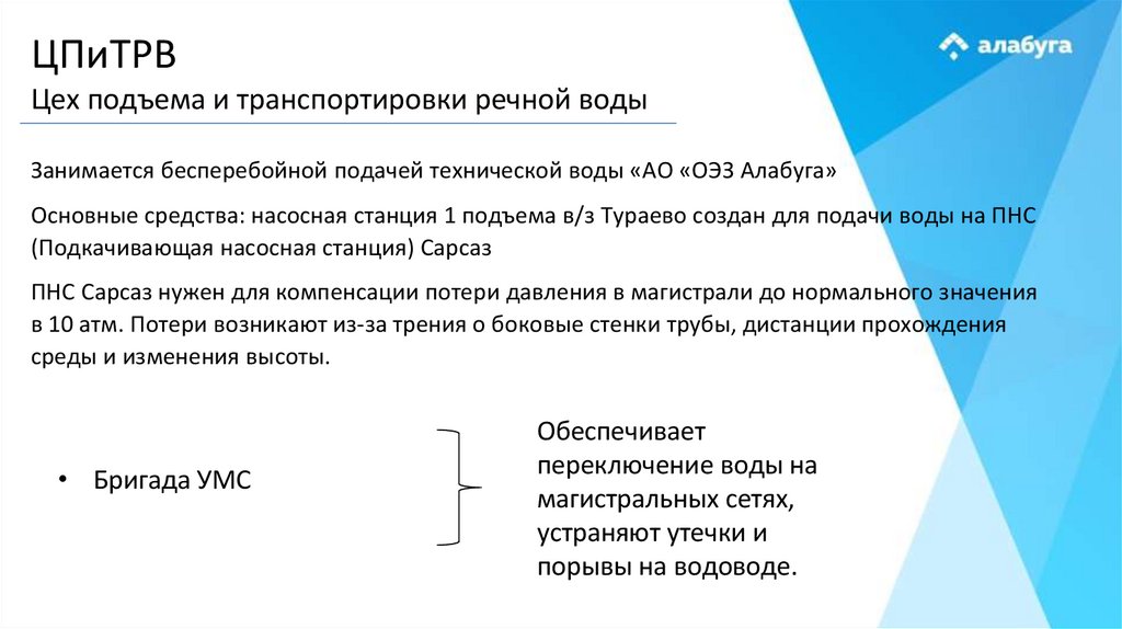 • ЦПиТВ (цех подъема и транспортировки речной воды)