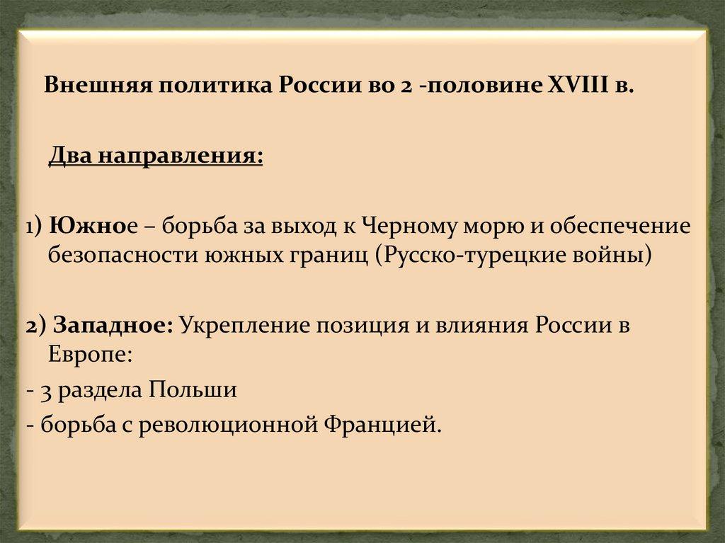 Внешняя политика России во 2 -половине XVIII в.Два направления: