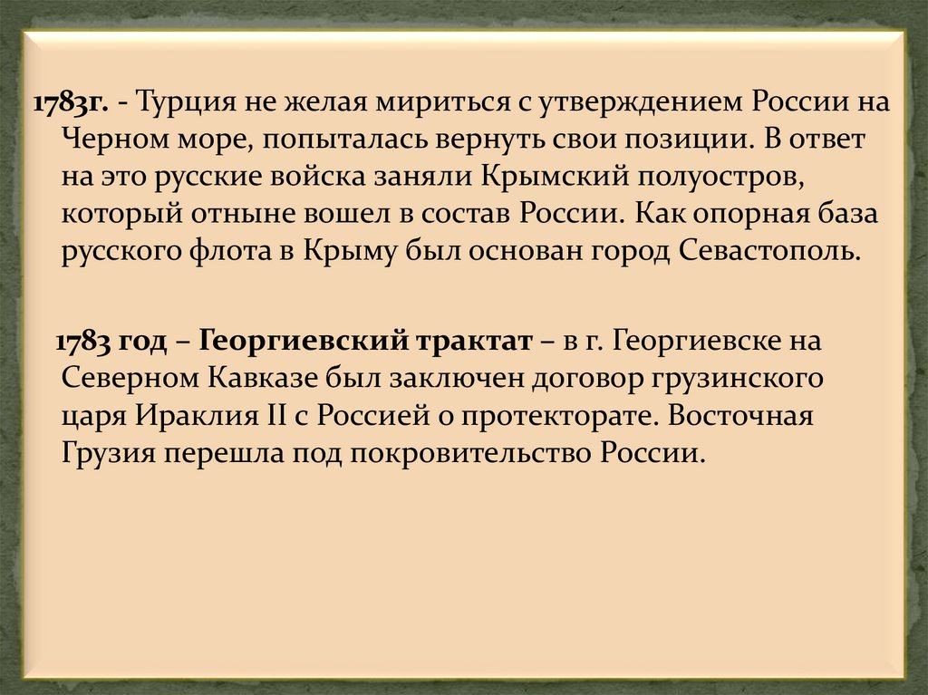 1783г. - Турция не желая мириться с утверждением России наЧерном море, попыталась вернуть свои позиции. В ответ