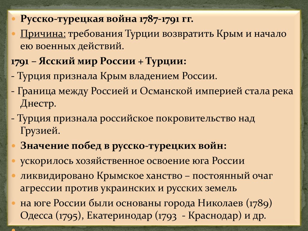 Русско-турецкая война 1787-1791 гг.Причина: требования Турции возвратить Крым и начало