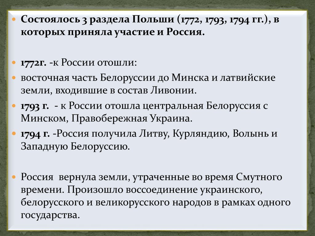 Состоялось 3 раздела Польши (1772, 1793, 1794 гг.), вкоторых приняла участие и Россия.