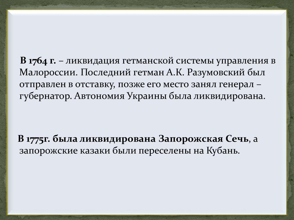 В 1764 г. – ликвидация гетманской системы управления вМалороссии. Последний гетман А.К. Разумовский был