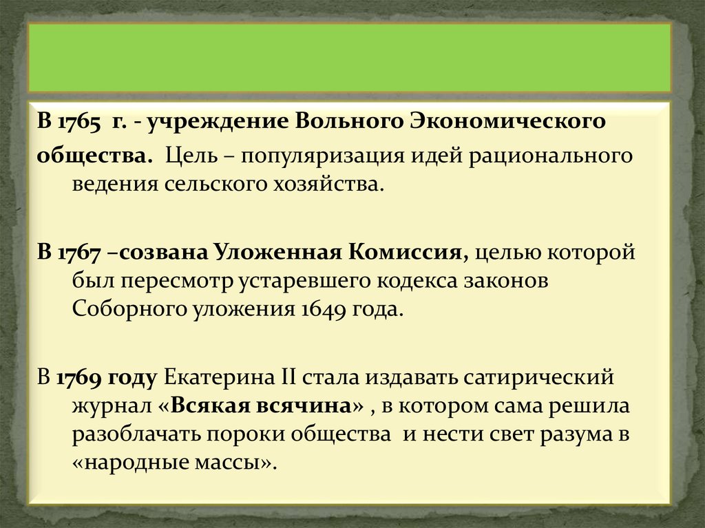В 1765 г. - учреждение Вольного Экономическогообщества. Цель – популяризация идей рационального