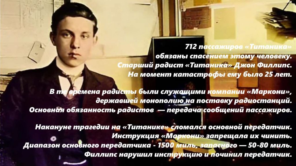 Сигнал Филлипса спас 712 человек. В последний момент его чудомпринял радист «Карпатии» Гарольд Коттэм. Он случайно задержался