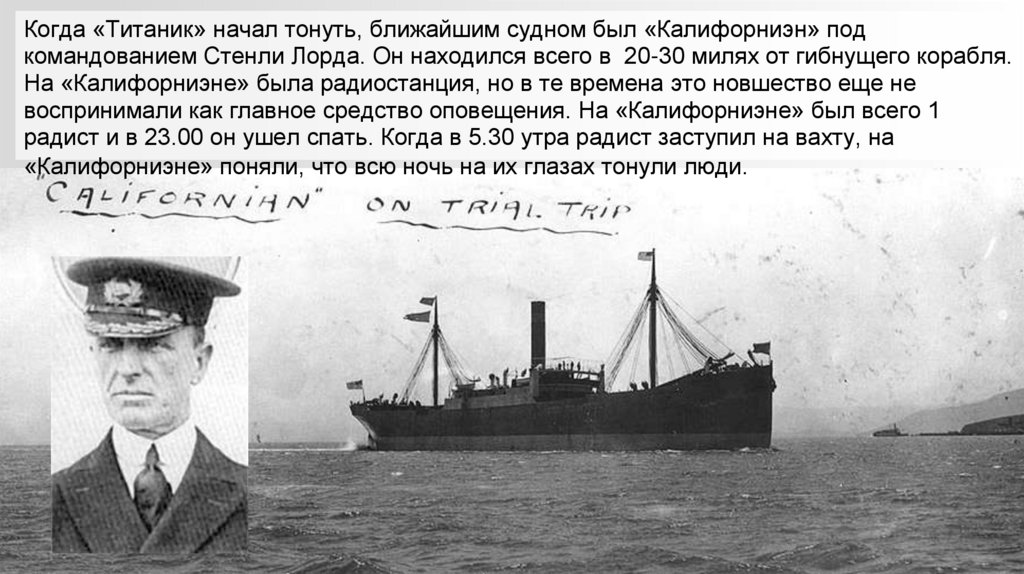 Когда «Титаник» начал тонуть, ближайшим судном был «Калифорниэн» подкомандованием Стенли Лорда. Он находился всего в 20-30 милях от гибнущего корабля.
