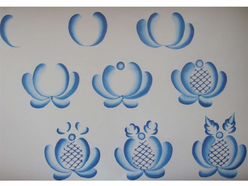 13. Самый излюбленный узор – гжельская роза. Иногда она изображена крупно, широкими мазками. А иногда написана тоненькой кисточкой.