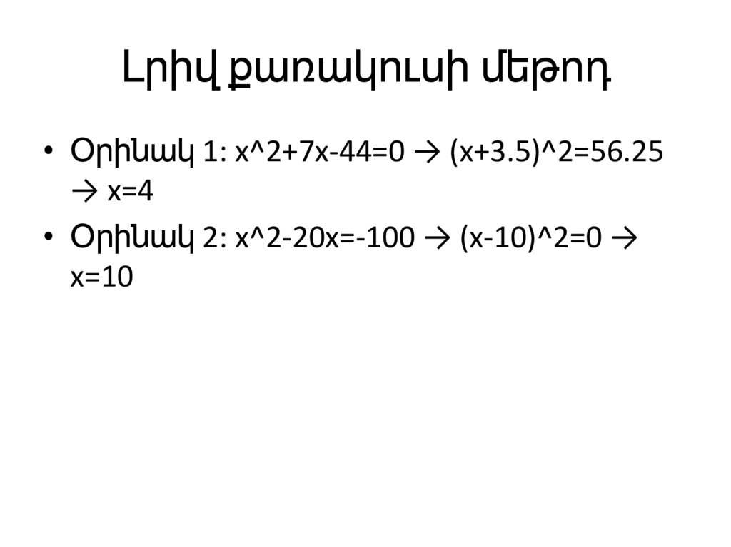 Լրիվ քառակուսի մեթոդ• Օրինակ 1: x^2+7x-44=0 → (x+3.5)^2=56.25