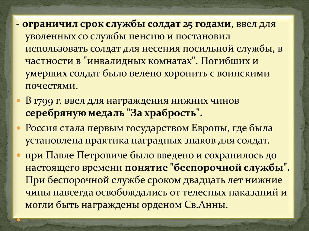 - ограничил срок службы солдат 25 годами, ввел дляуволенных со службы пенсию и постановил