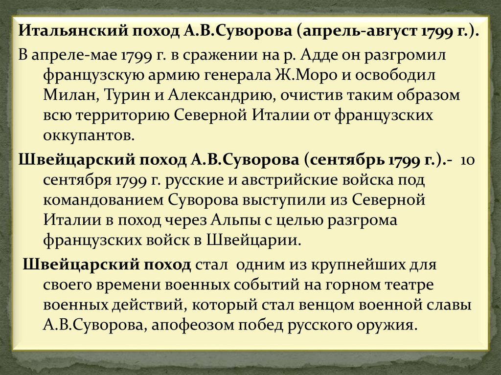 Итальянский поход А.В.Суворова (апрель-август 1799 г.).В апреле-мае 1799 г. в сражении на р. Адде он разгромил