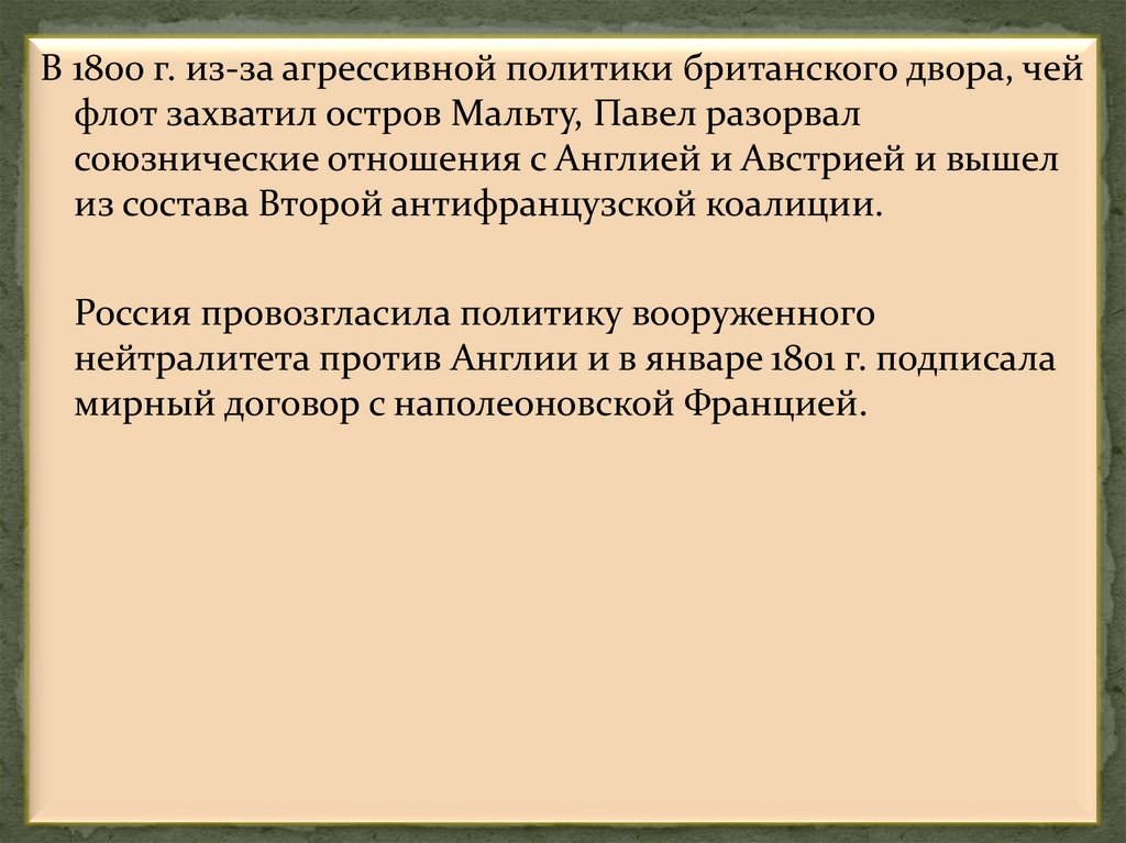 В 1800 г. из-за агрессивной политики британского двора, чейфлот захватил остров Мальту, Павел разорвал