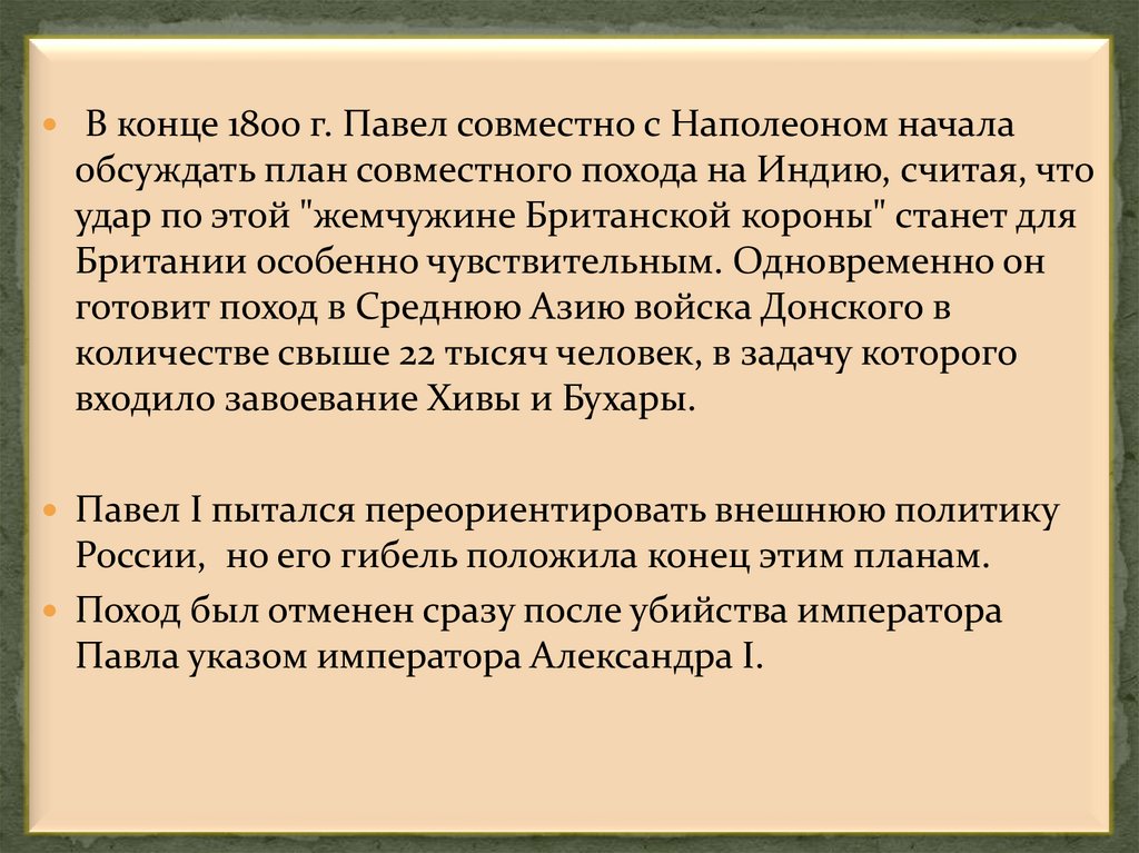 В конце 1800 г. Павел совместно с Наполеоном началаобсуждать план совместного похода на Индию, считая, что