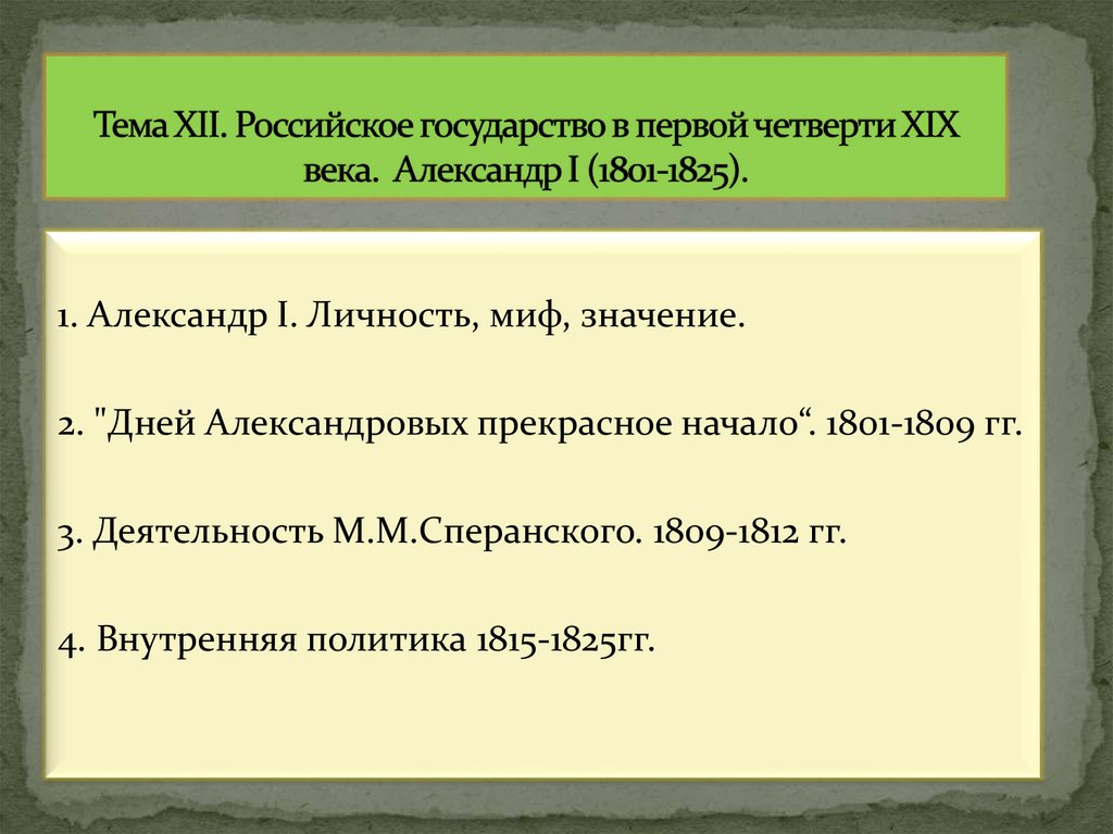 1. Тема XII. Российское государство в первой четверти XIX века. Александр I (1801-1825).