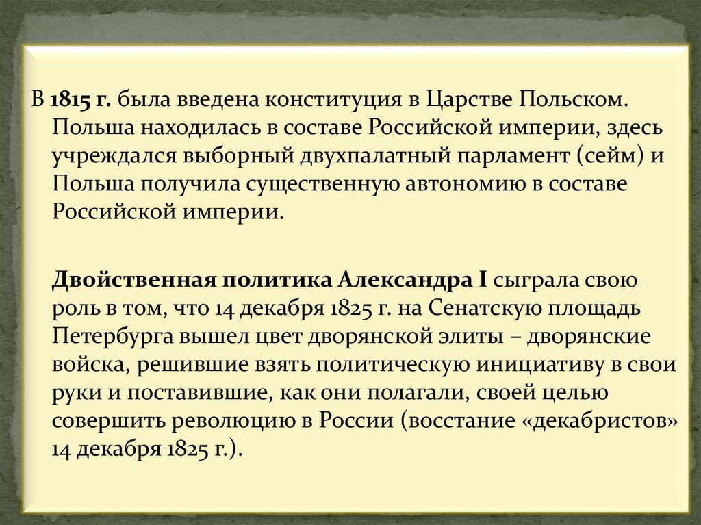 В 1815 г. была введена конституция в Царстве Польском.Польша находилась в составе Российской империи, здесь
