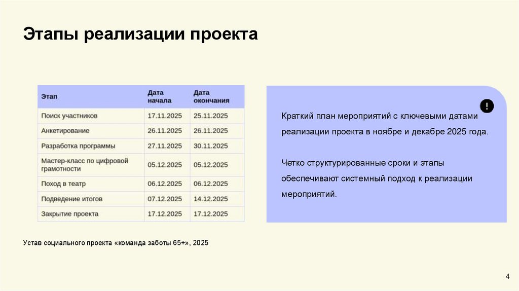 Этапы реализации проектаКраткий план мероприятий с ключевыми датами
