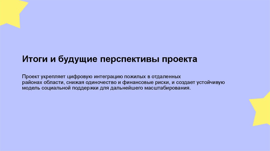 Итоги и будущие перспективы проектаПроект укрепляет цифровую интеграцию пожилых в отдаленных