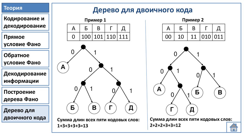 1. Каждый узел дерева Фано имеет ровно две ветви, при этом